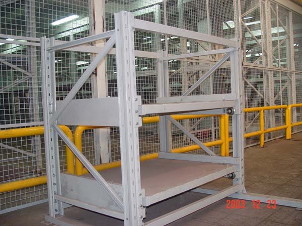三格四層標(biāo)準(zhǔn)抽屜式模具架;規(guī)格;高H2000*深D615*長L3100MM 每格長888 1、每塊抽屜板可承重800-1000KG 2、天車(行車)承重800-1000KG 3、抽屜板可拉出65% 4、安全可靠附加保險(xiǎn)裝置 5、操作輕便采用軸承組合,滑動平衡并附獨(dú)立吊模裝置 6、節(jié)省場地,占地面積積為1.8平方米,可存放幾十套中小型模具 7、結(jié)構(gòu)簡單,由多種組合部件組裝而成,便于拆卸、運(yùn)輸和組裝